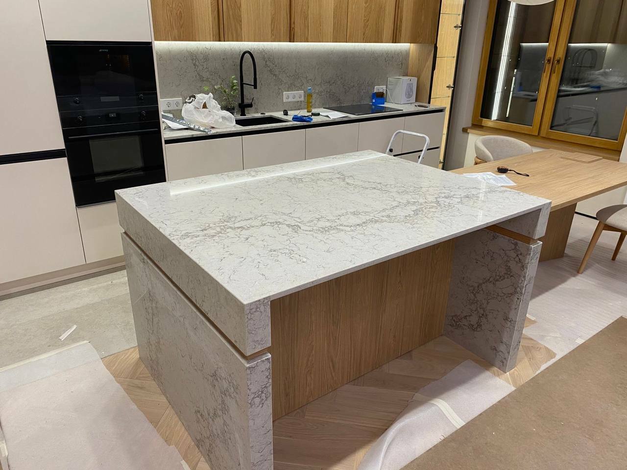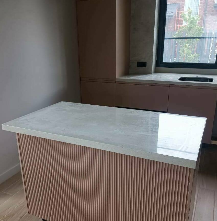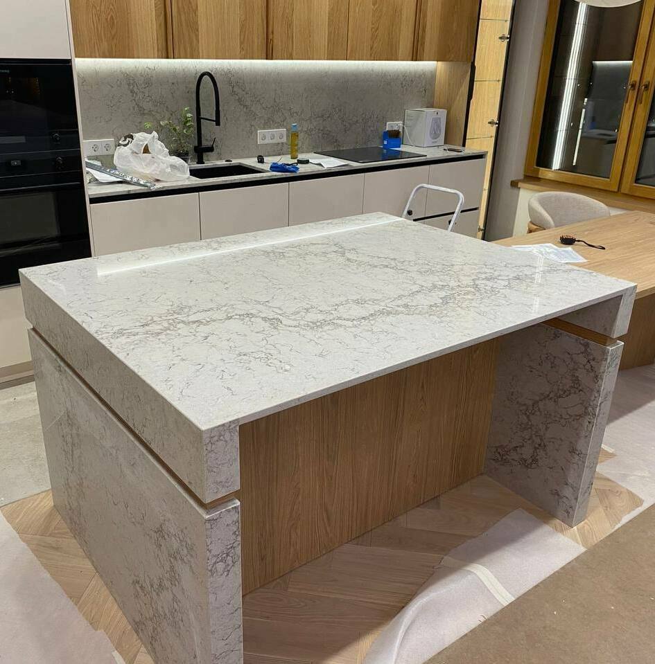 Мы работаем с такими искуственными камнями как кварцевый агломерат ( 95 % минералы и 5 % полиэфирных смол) и акрилом. Работаем с различными произвадителями слэбов искуственного камня. Более 500 вариантов разных расцветок. Просчет индивидуальный, но очень быстрый.